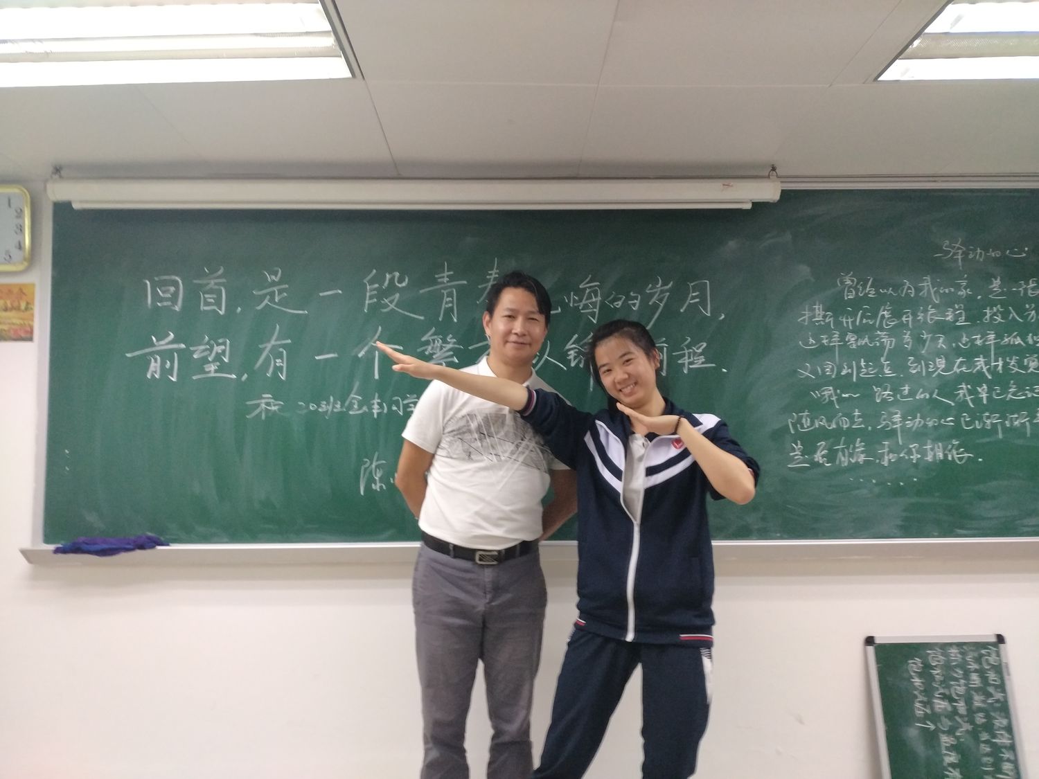 这张照片的在2018年5月18日最后一次答疑课时拍的,那天心情有些失落,因为教了一年的班级学生都要去海阔天空遨游了,内心有些不舍,所以没有说太多话,学生说一直想让听我唱一首歌,其实上一届 学生也有要求说想听,但后来我怕唱不好,没有唱,留下了遗憾,这次我便放开了,教他们唱了一首姜育恒的老歌《驿动的心》,没想到他们三遍就学会了,果然是青出于蓝啊,然后就拍了很多照片,照片上那个活泼的女孩就是慧琳,很喜欢那清澈的眼神,夸张可爱有创意的动作,让我突然年轻了许多。