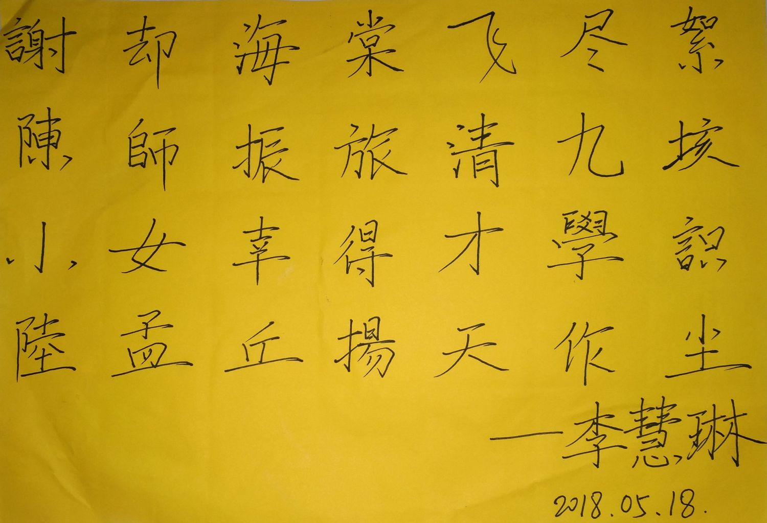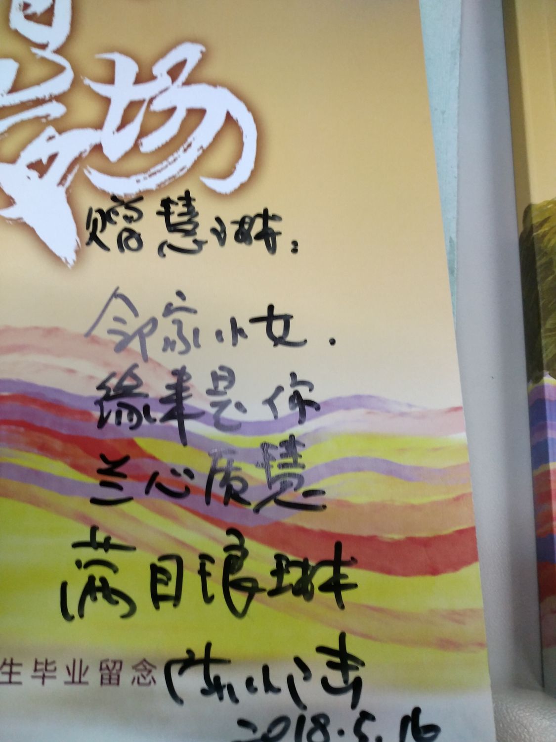 这是写在慧琳同学毕业纪念册的句子,当时拿来让我留言的时候,她的纪念册已经写到满满的了,都是同学的祝福,祝福太多,我便写了几个词语,在里面嵌入了她的名字,没想到她很喜欢。当然,我也不是随便写的,这几个词基本写出了她的性格和品质。兰心质慧,现在,慧琳在广州一个大学读医学,以她的细心和聪明能干一定会是一个好医生。特此祝福!